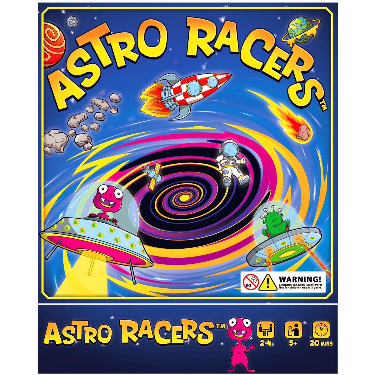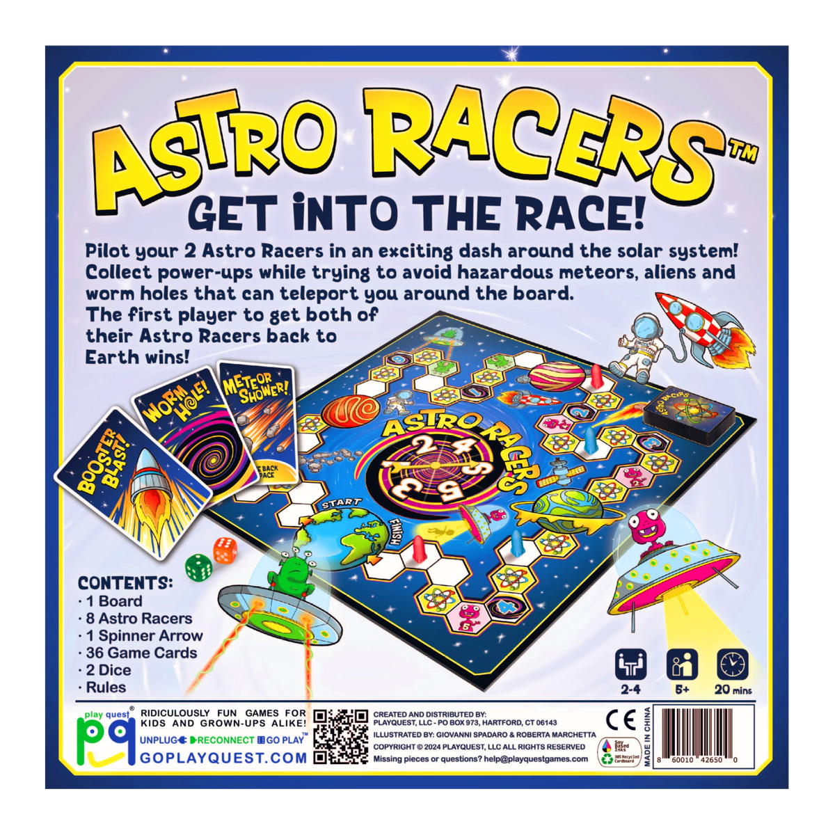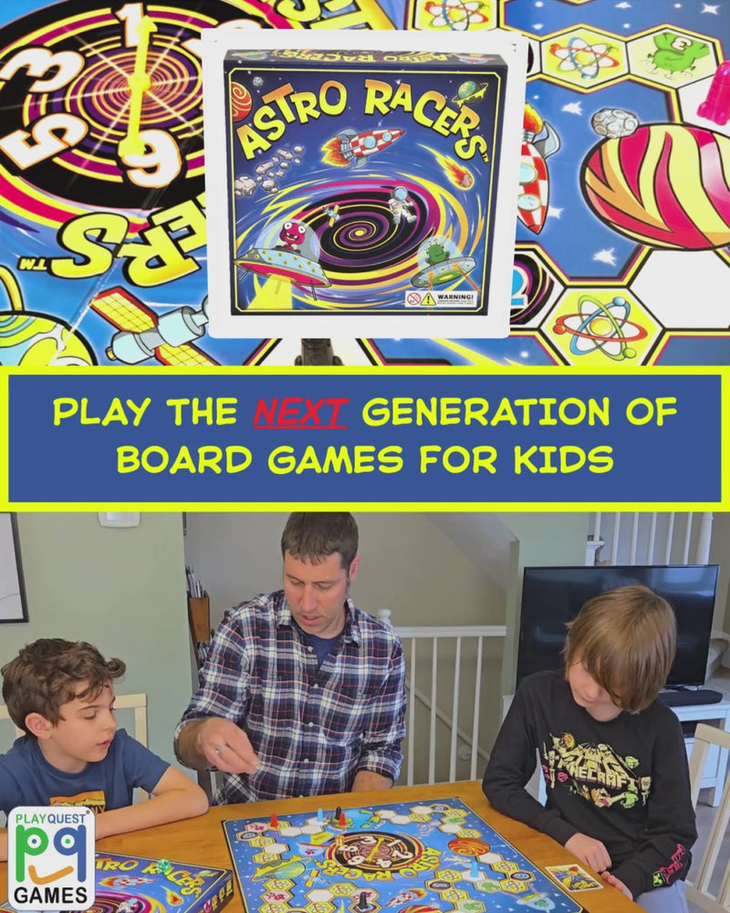 Blast off into an exciting adventure with ASTRO RACERS, the next generation in family-friendly board games from PlayQuest! In this thrilling space race set in the year 3001, players take control of two supercharged Astro Racers competing in the INTERGALACTIC 5 BILLION. Navigate your racers around the Solar System, collecting power-ups while avoiding hazardous meteors, aliens, and wormholes that can teleport you across the board. The first player to successfully return both racers to Planet Earth claims victory! With an average play time of 20 minutes for two players and accommodating 2-4 players total, this patent-pending game offers high strategic elements while remaining enjoyable for ages 5 and up. Perfect for family game nights, ASTRO RACERS® provides entertainment that both kids and adults will love. On your marks... get set... let the Astro Race begin!